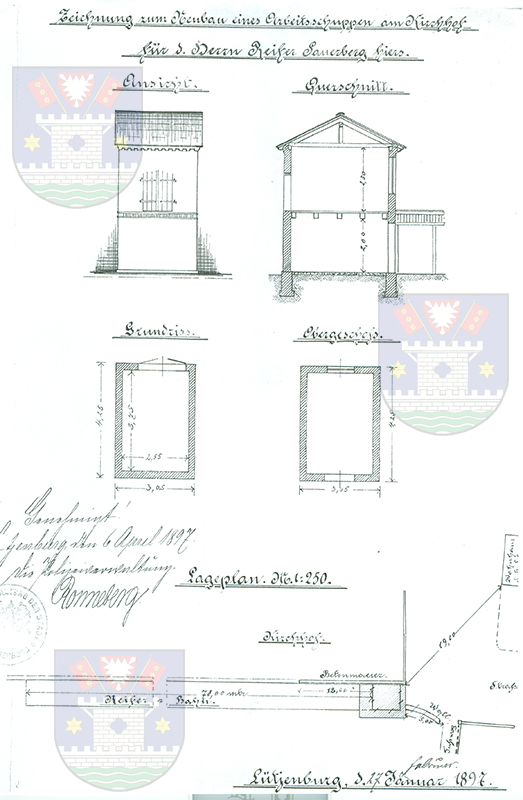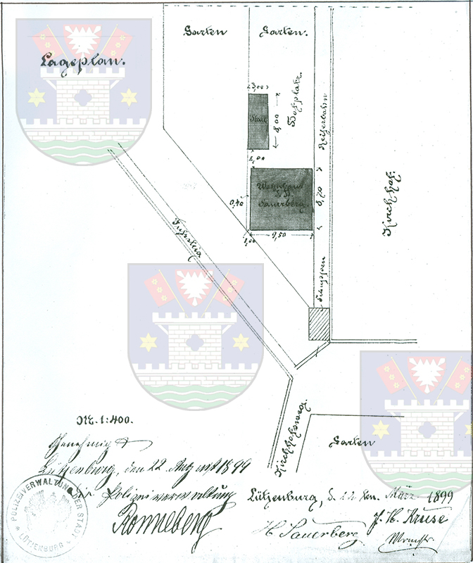 Da das Grundstück der Kirche gehörte, ging der Bauantrag zunächst an die Kirche und erst dann an die Stadtverwaltung. Die Verhandlungen müssen recht kompliziert gewesen sein, denn der Bauantrag wurde erst zwei Jahre später, am 22. März 1899, von Heinrich Sauerberg unterschrieben und von Bürgermeister Hermann Ronneberg seitens der Polizeiverwaltung der Stadt Lütjenburg am 22. August 1899 mit Unterschrift und Siegel genehmigt. Aus dem erhaltenen Lageplan geht hervor, wo genau die genannten Gebäude errichtet werden durften. Dabei ist vor allem interessant, dass sich die genehmigte „Reiferbahn“ direkt an der Ostgrenze des Friedhofs, parallel zur östlichen Lindenreihe, befand. Ihre Länge betrug 78 Meter und erstreckte sich in Richtung der Straße „Auf dem Kamp“, der damals noch nicht erschlossenes Kirchengelände war. Wo heute die Mensingstraße verläuft, führte damals ein schmaler Fußsteig in Richtung Mühlenstraße.