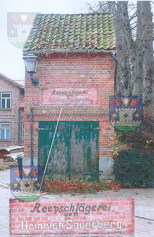 Hartmut Tretow hat sich einmal die Mühe gemacht, die Beschriftung zu rekonstruieren. Dort stand geschrieben: „Reepschlägerei Heinrich Sauerberg“. Dass in einer Reepschlägerei früher Stricke, Seile und Taue hergestellt wurden, ist bekannt. Aus der Bauakte geht hervor, dass „Reifermeister“ Heinrich Sauerberg am 2. März 1997 einen Bauantrag für die Errichtung eines Wohnhauses mit Stall, Arbeitsschuppen und „Reiferbahn“ stellte.