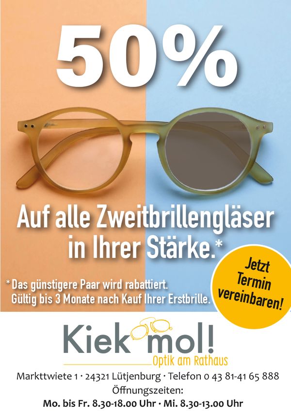 50 % auf Zweitbrillengläser bei Kiek mol! Optik am Rathaus in Lütjenburg
