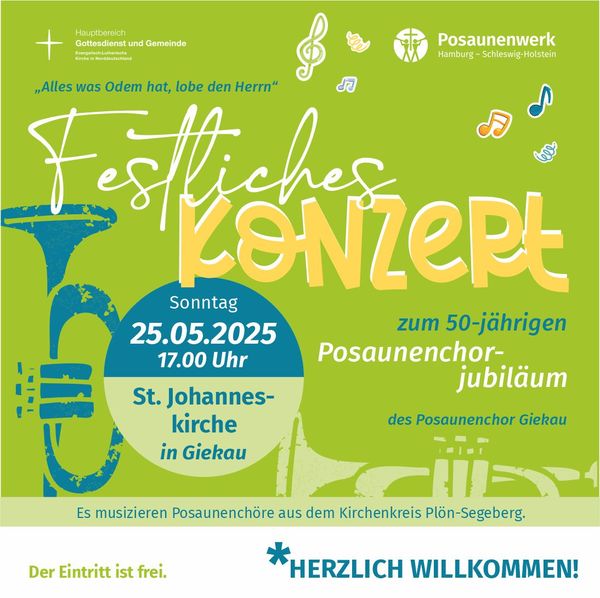 (km) Wir feiern mit einem festlichen Bläserkonzert am 25. Mai um 17 Uhr. Dann sind in der Giekauer St. Johannes-Kirche die Posaunenchöre des Kirchenkreises Plön-Segeberg von Laboe bis Bad Oldesloe zu Gast. Ca. 40 Bläserinnen und Bläser spielen Musik aus verschiedenen Epochen. Unter dem Motto aus Psalm 150 "Alles was Odem hat, lobe den Herrn" von Friedrich Silcher wurde schon auf dem Deutschen evangelischen Posaunentag 2024 in Hamburg gespielt. Es kommt aber auch ganz neue Bläsermusik von zeitgenössischen Komponisten zu Gehör. Die Leitung des Konzertes haben Landesposaunenwart Daniel Rau und Kantor Knut Matthiesen. Ein Höhepunkt im Programm wird auch die Ehrung langjähriger Mitglieder in Posaunenchören sein.