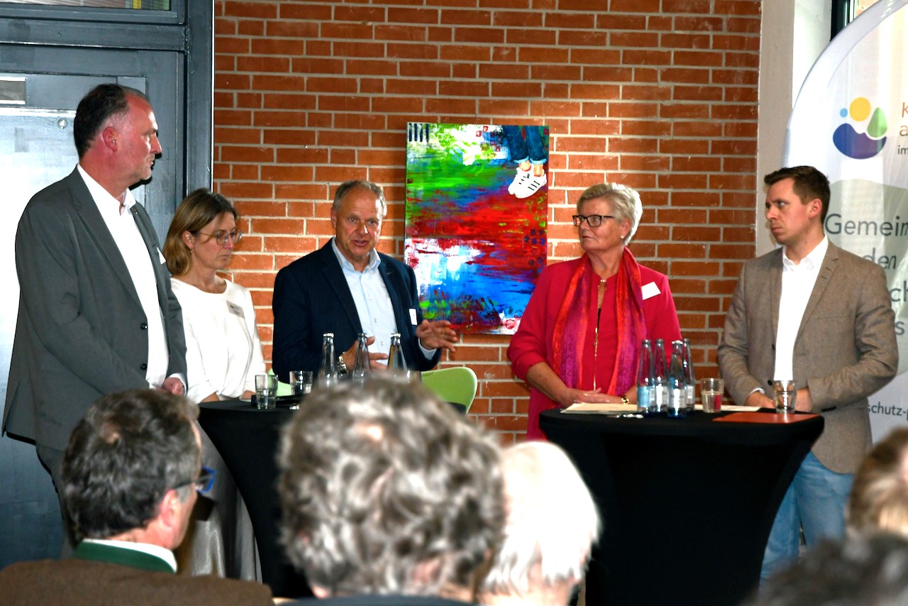 Im Hinblick auf die Akzeptanz für Maßnahmen zur Energiewende wurde mehrfach geäußert, dass hier intensive Kooperation und direkter Austausch „mit hoher Transparenz“ eine notwendige Voraussetzung sei. Ebenso muss der Bau von Photovoltaik-Freiflächenanlangen oder Windkraftanlagen und ihre Netzanschlüsse bzw. Speichermöglichkeiten koordiniert werden – möglichst bereits beim Start der Planungen. Dabei wurde der Fokus durch Nachfrage aus dem Auditorium auch auf die Möglichkeiten regionaler Nutzung der Energie gelenkt, in der ein großes Potential gesehen wird. Ein konkretes Beispiel zu Hindernissen in der Energiewende kam aus Wahlstorf: Trotz laut Bürgermeister Sven Petersen bereits stark vorhandener Akzeptanz für die vorhandenen Windkraftanlagen, dürfen diese zukünftig nicht repowered werden. Der Grund dafür ist auf Seiten der Landesplanung die Lage im Seeadlerdichtezentrum.
