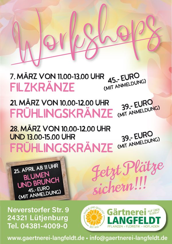 „Bei uns werden regelmäßig die verschiedensten Workshops angeboten, die auch Nichtgeübte ganz leicht hinbekommen. So entstehen passend zu den Jahreszeiten Tür-,Tisch- oder Haarkränze, es werden Gläser mit Frühlingszwiebeln dekoriert oder man lässt sich bei einem Überraschungs-Workshop einfach einmal kreativ überraschen. Die Gärtnerei Langfeldt bietet auch Workshops für Jungesellinnen-Abschiede, Firmenevents oder Geburtstage an, die auf Anfrage gebucht werden können und ganz individuell für euch gestaltet sind. Falls ihr noch ein Geschenk für eure Freundin oder Mama zum Muttertag braucht, gibt es auch Gutscheine für einen Workshop zum Verschenken“, freut sich Chefin Nadja Langfeldt. „Alle Teilnehmenden kommen bei den Aktionen in den Genuss, in den Beruf der Floristik reinzuschnuppern und dabei ein paar Werkstücke für zuhause zu zaubern.“
