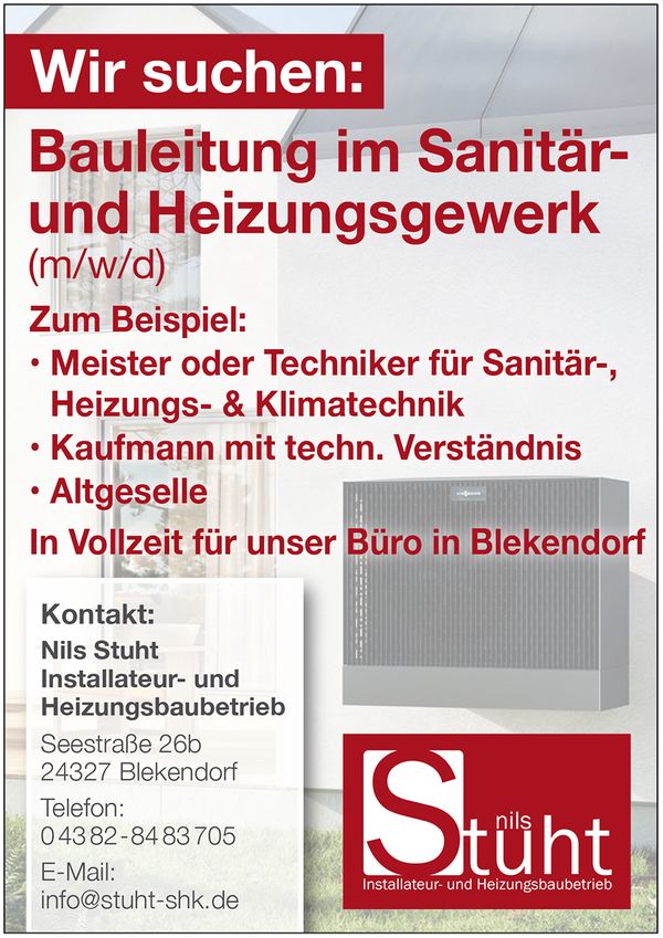 (pg ©) Nils Stuht gründete sein Heizung-/Sanitärunternehmen im Jahre 2020 in Blekendorf. Das Team, bestehend aus dem Chef und acht Mitarbeitenden, machte sich in der Region wegen seiner Kompetenz und Verlässlichkeit schnell einen guten Namen. Ab dem 1. August 2026 kommt noch ein Azubi hinzu. Aktuell wird zusätzlich eine Bauleitung im Sanitär- und Heizungswerk in Vollzeit gesucht.