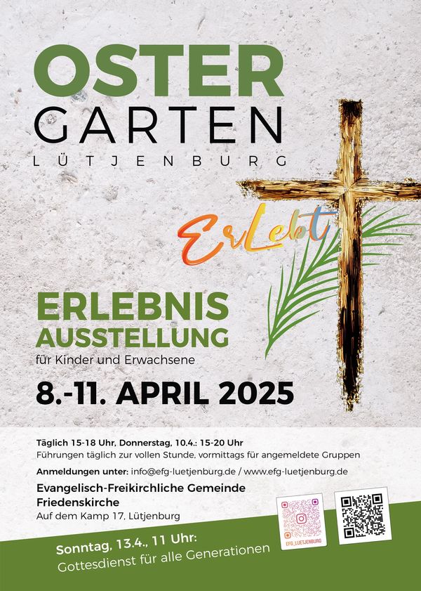 Am Sonntag, 13. 4., wird ab 11 Uhr ein Gottesdienst für alle Generationen mit Führungen durch den Ostergarten stattfinden. Weitere Informationen gibt Pastor Matthias Lange, Tel.: 04621 – 302746.