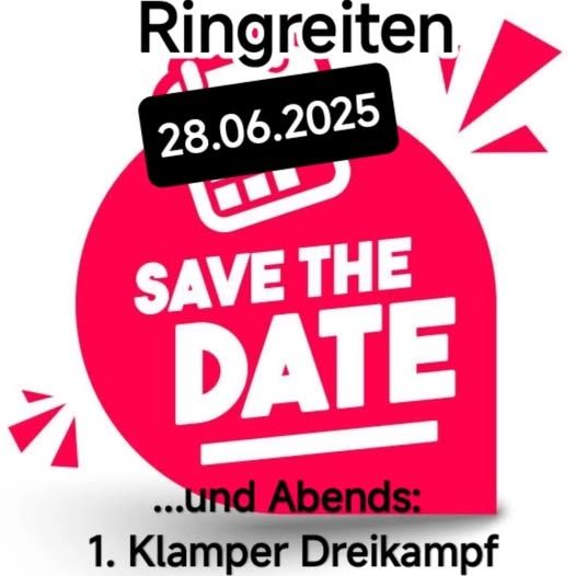 (pg) Die Freiwillige Feuerwehr Klamp lädt ein zum 22. Ringreiten in Klamp am 28.06. ab 14 Uhr in Wentorf hinter der Mehrzweckhalle. Kinder bis 6 / 7 Jahre auf Führpony 8 €. Es werden 2 Führponys gestellt (ggf. Spende; begrenzte Reiterzahl). Kosten: Jugendliche bis einschl. 17 Jahre 10 €. Erwachsene ab 18 Jahre 12 €. -- Anmeldeschluss. 15.06.2025. Anmeldungen ab 19 Uhr bei: Fa. Glessmann 0172 -408 4211 oder 0176 – 21 422 470. -- Abends „1. Klamper 3-Kampf“. Es gibt attraktive Fleischpreise zu gewinnen. Den ganzen Tag über gibt es Kuchen, Gegrilltes, Getränke, Hüpfburg & Fußballdart für kleine & große Gäste.