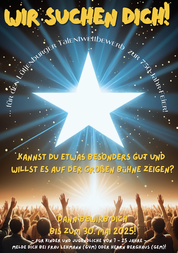 (sl) Für die „junge“ Talente-Show während der 750-Jahr-Feierlichkeiten der Stadt Lütjenburg wird unter allen Schülerinnen und Schülern der 1.-13. Klasse geworben, und es werden junge Talente gesucht. Die Schulen werden bei großem Andrang ihre Talente vorauswählen, damit die Veranstaltung einen ernsten Charakter behält. Die Talente-Show findet im großen Festzelt auf der Bühne am Do., 03. Juli 2025 beim Kinder– und Jugendtag zwischen 13.00 und 15:30 Uhr statt.