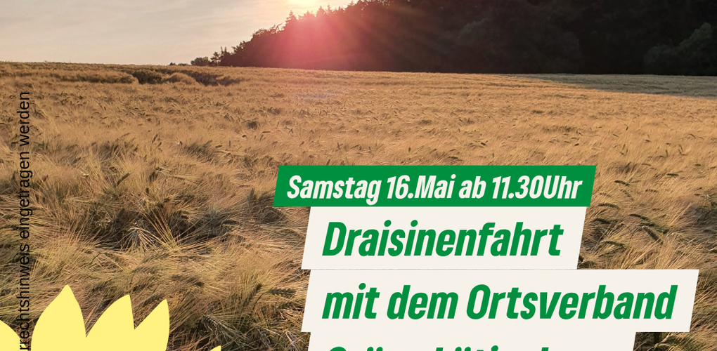 (eg) Am Samstag den 16.Mai veranstaltet der Grüne Ortsverband Lütjenburg eine Draisinenfahrt auf der Strecke Lütjenburg-Malente. Alle Interessierten sind herzlich eingeladen. Wir starten am Bahnhof Lütjenburg (Aldi-Parkplatz) um 11.30 Uhr. Für eine Stärkung unterwegs ist gesorgt und die Rückkehr ist für 15.00 Uhr geplant. Genießen Sie mit uns das Grün von Wäldern, Knicks und blühenden Feldern. Die Tour ist auch für Familien geeignet und natürlich kostenlos. Bitte melden Sie sich bis zum 1. Mai an unter: andrea.isemer@gruene-luetjenburg.de - Wir freuen uns auf eine gemeinsame Fahrt und nette Gespräche -