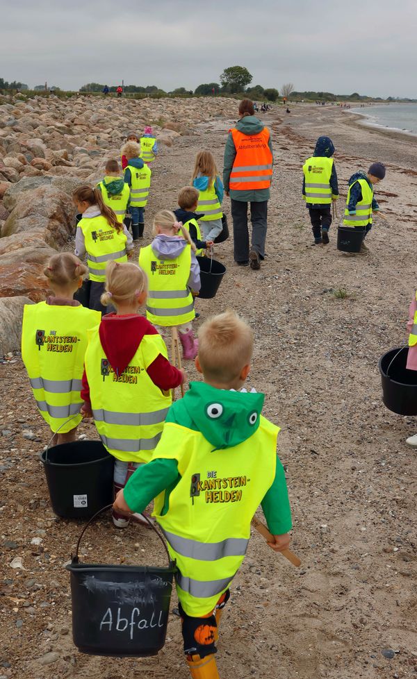 Bereits am 19. September 2025, dem Freitag vor dem Coastal Cleanup Day, hat die Abfallwirtschaft des Kreises Plön gemeinsam mit den Natur-, Umwelt- und Abfallberatungsstellen eine Aktion gestartet, um auf die Verschmutzungen an den Stränden aufmerksam zu machen. Um die 70 Kinder aus dem Kindergarten Hohenfelde und der Grundschule aus Schwartbuck haben sich am 19. September 2025 entschlossen gegen die Verschmutzung des Hohenfelder Strandes gestellt. Mit Abfalleimer und Abfallzangen ausgerüstet haben die Kinder den „wilden Abfällen“ den Kampf angesagt. Die einzelnen Gruppen, begleitet mit jeweils einem Betreuer der Umwelt- und Abfallberatungsstellen und mehreren Freiwilligen aus dem Freiwilligen Ökologischen Jahr (FÖJ), haben nicht nur Zigarettenstummel und Eisstiele gesammelt, der spektakulärste Fund war ein Gummistiefel. Auf einer ausgebreiteten Plane mit Rest-, Papier-, und Bioabfallbehälter sowie einer gelben Tonne für Verkaufsverpackungen konnten die Kinder die gesammelten Mengen von ca. 30 Kilogramm ausbreiten und in die jeweiligen Abfallbehälter sortieren.