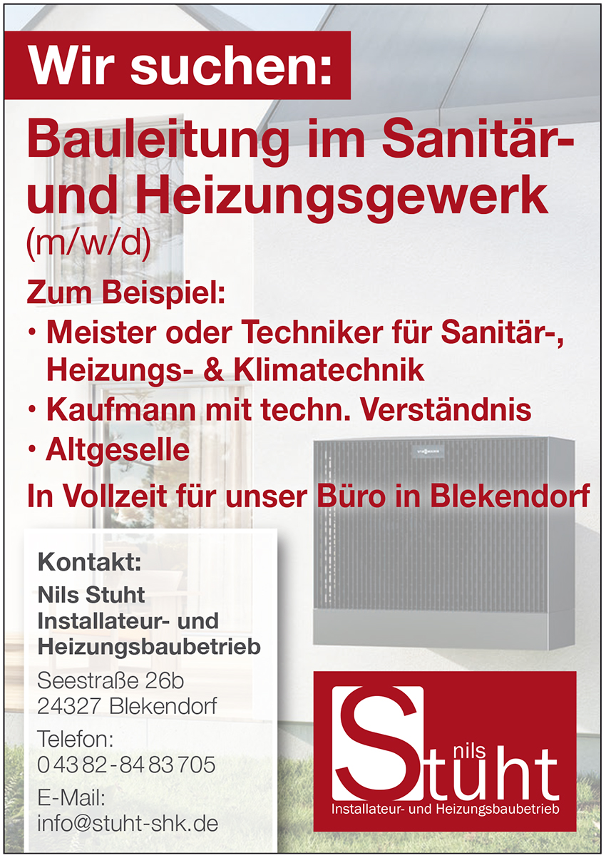 (pg ©) Nils Stuht gründete sein Heizung-/Sanitärunternehmen im Jahre 2020 in Blekendorf. Das Team, bestehend aus dem Chef und acht Mitarbeitenden, machte sich in der Region wegen seiner Kompetenz und Verlässlichkeit schnell einen guten Namen. Ab dem 1. August 2026 kommt noch ein Azubi hinzu. Aktuell wird zusätzlich eine Bauleitung im Sanitär- und Heizungswerk in Vollzeit gesucht.