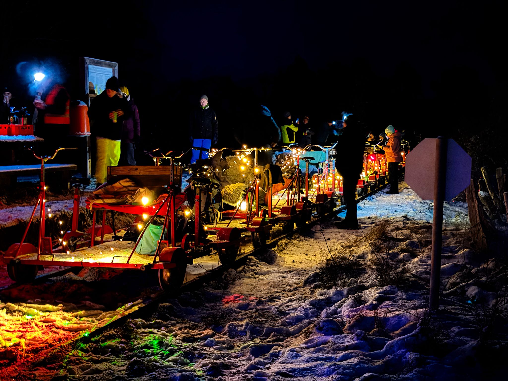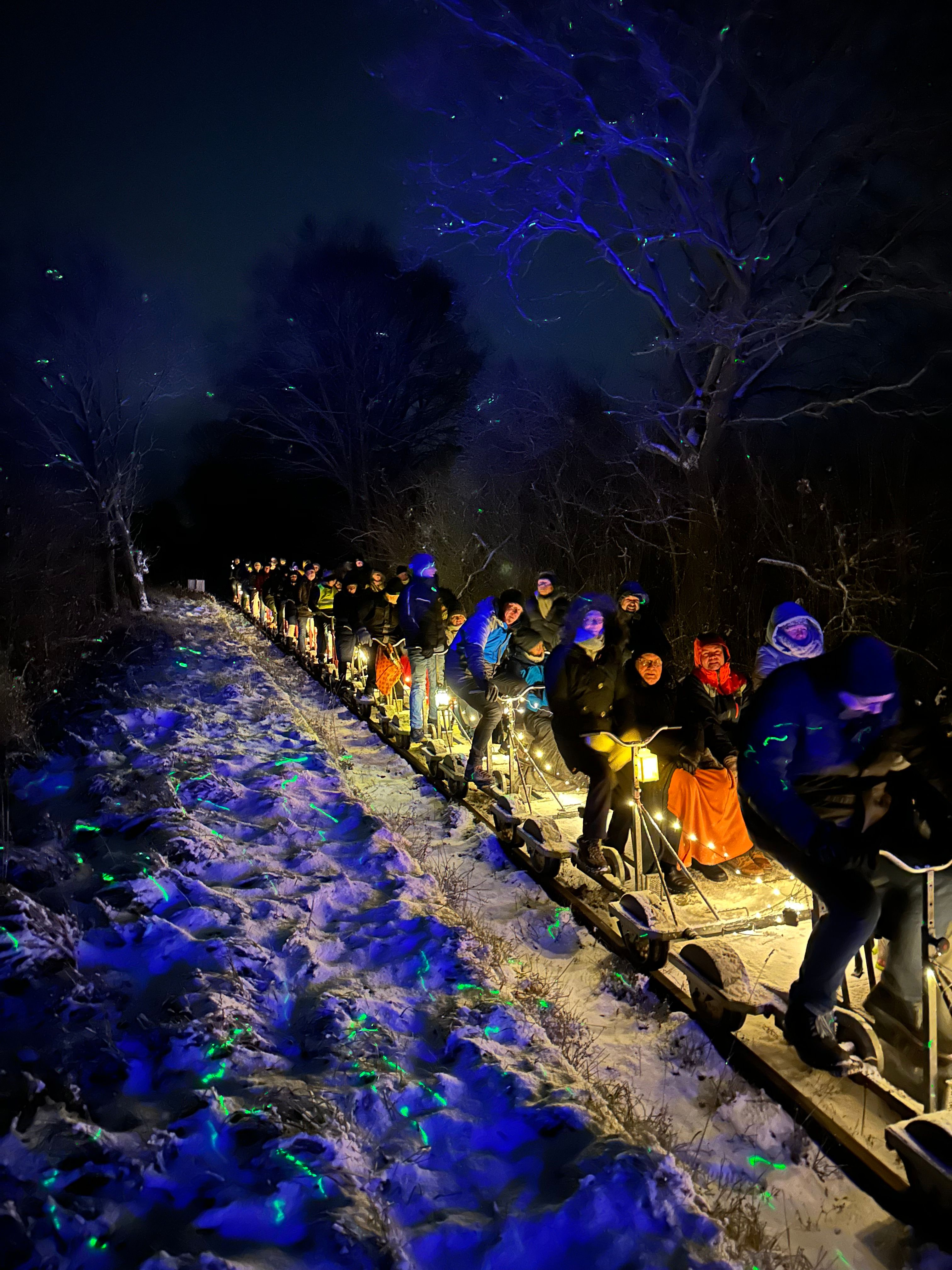 (sr) Für das erste Wochenende des neuen Jahres hatte der Verein Schienenverkehr Malente-Lütjenburg e.V. (SML) nun schon bereits zum vierten Mal eine winterliche Lichterfahrt mit Fahrrad-Draisinen auf der Bahnstrecke Malente-Lütjenburg angekündigt. Diesmal war das Interesse so überwältigend, dass gleich ein zweiter Termin für den nächsten Tag eingeplant werden musste, nachdem der Samstag bereits Anfang Dezember ausgebucht war. Insgesamt gingen an beiden Tagen 44 Draisinen gebuchte Draisinen auf die Strecke. Der Verein konnte insgesamt knapp 180 Besucher an den beiden Tagen begrüßen.