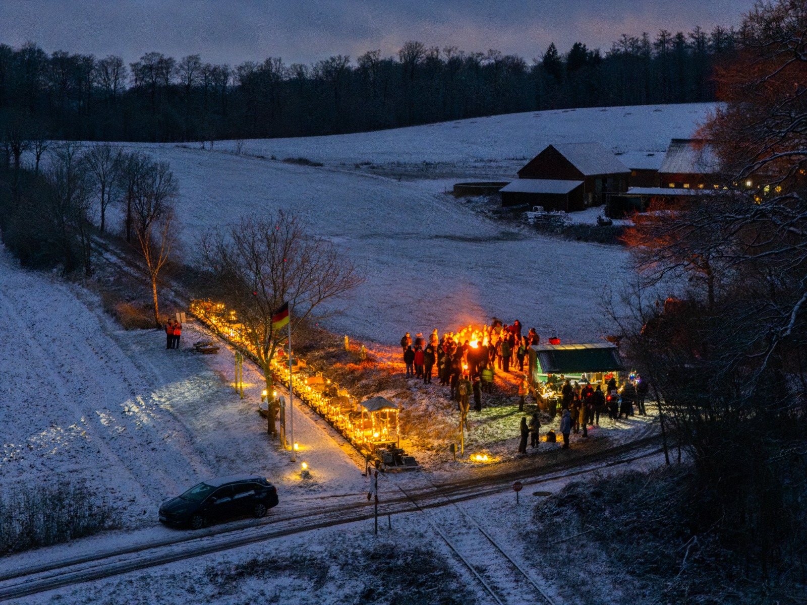 Startete man am Samstag in Malente noch trocken und schneefrei, so hatte der Wettergott bald winterliche Verhältnisse parat. Dies sorgte für eine malerische Landschaft und eine spektakuläre Wirkung der stimmungsvoll beleuchteten Schienenfahrzeuge.